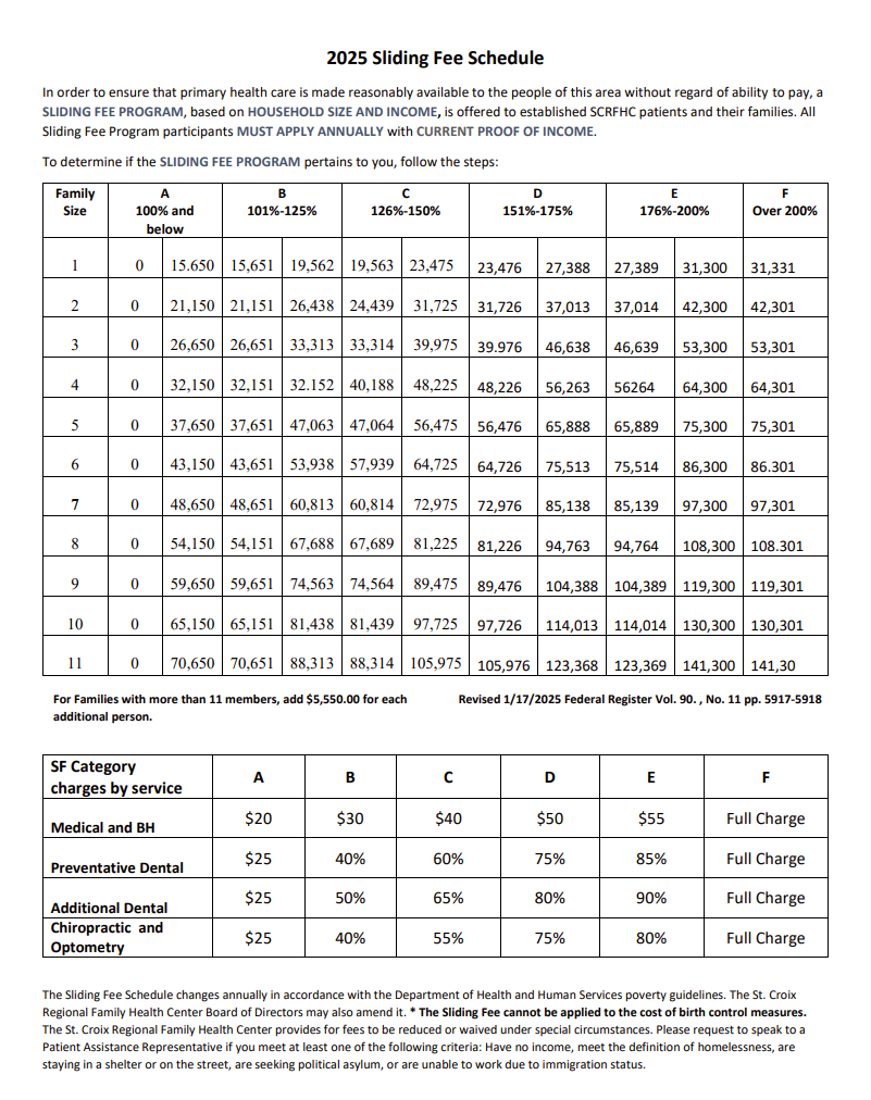 The Sliding Fee schedule changes annually in accordance with the Department of Health and Human Services poverty guidelines. The St. Croix Regional Family Health Center Board of Directors may also amend it. Sliding Fee cannot be applied to the cost of birth control measures.